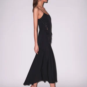 Our Gia Gown, cut from lightweight silk georgette with lace up side details. Features fitted lined top with unlined bottom skirt. Adjustable straps and invisible back zip closure. Pair with your favorite heels for a dreamy nighttime look.Â